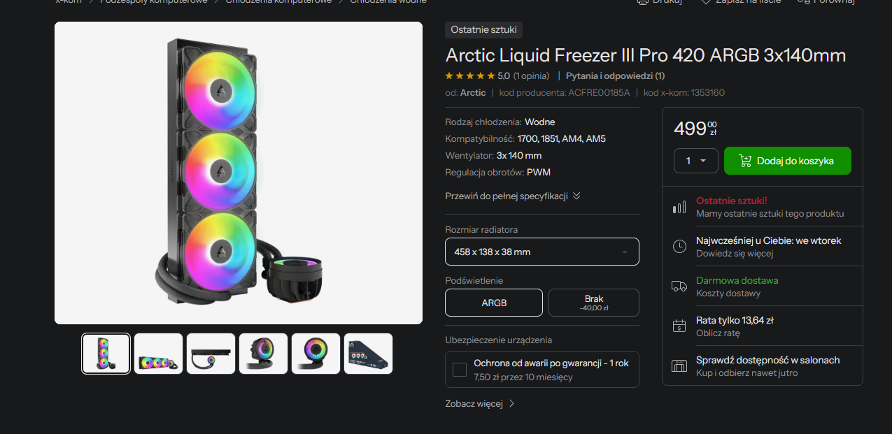 17. Cześć, właśnie składam powodli nowy komputer (jak średnio co 8-10 lat) i pierwszy raz będę miał styczność z AIO. Czytam, szukam ale nadal nie wiem, jakie wybrać. Wstępnie myślałem o Arctic Liquid Freezer III Pro 360, ale podobno jest strasznie głośne. Zależy mi na czymś, co będzie ciche i wydajne, ale nie wiem w jakim budżecie - to zależy od tego co jest do wyboru. Czy możecie poradzić, jakie chłodzenie aIO wybralibyście do 9800X3D do obudowy Lancool 217? Wziąć Arctic Liquid Freezer III Pro 360, czy dopłacić do czegoś lepszego?