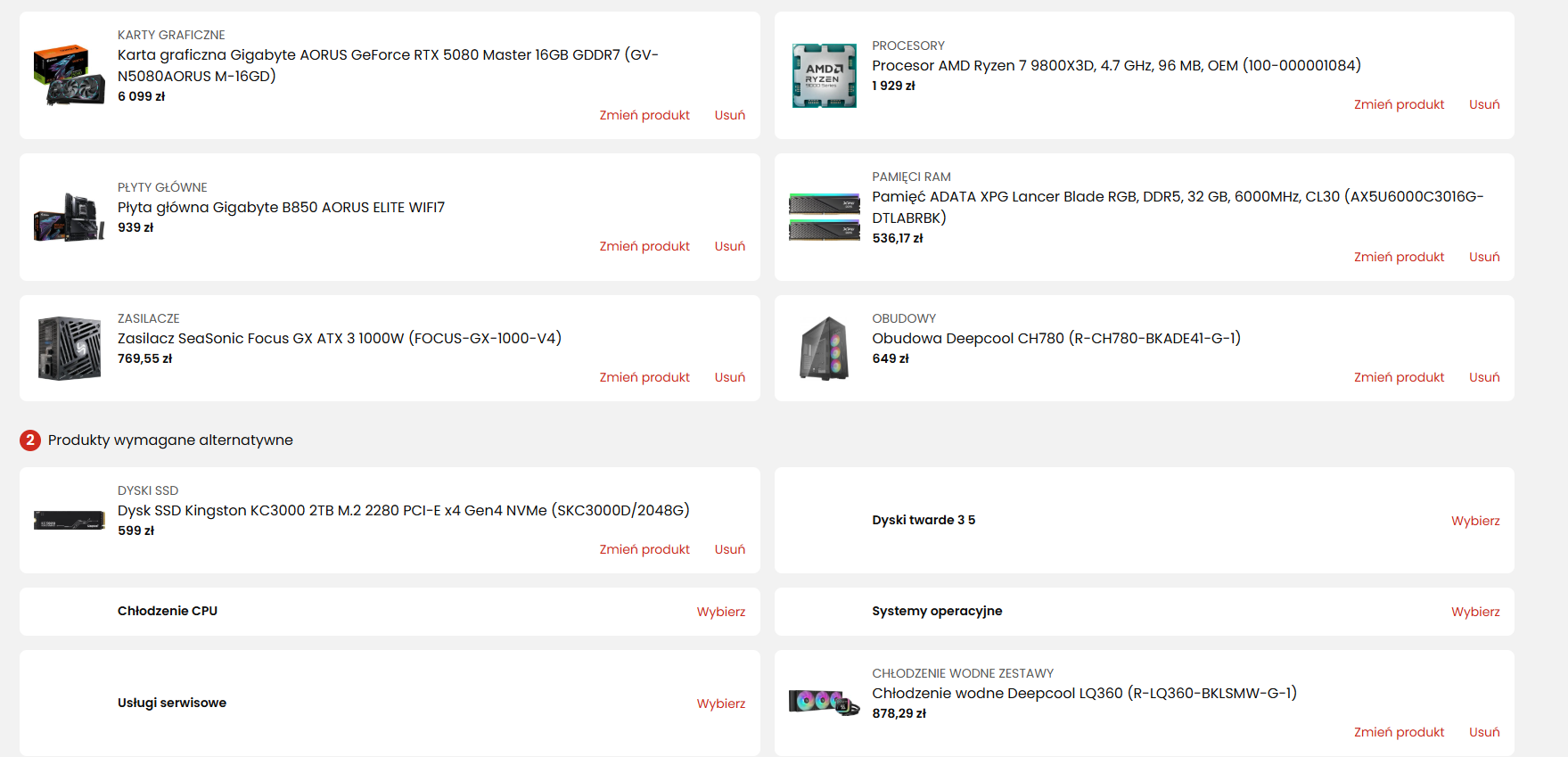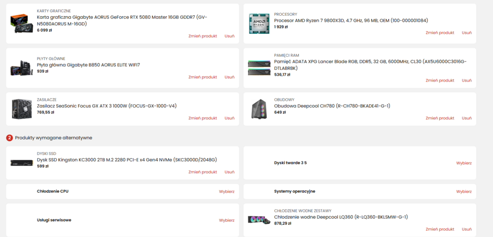 Zmień sklep, z prockiem wyjdzie tam 5000 zł, tu masz za 4650 z tańszym MOBO. Za 700 zł to już masz B850 z PCIE 5.0 dla GPU, dodatkowo pamięci z niższymi timingami https://proline.pl/koszyk/aae4db6b Zasilacz to masz z zapasem nawet do 5080 i gdybyś kiedyś wziął tu 9800X 3D.