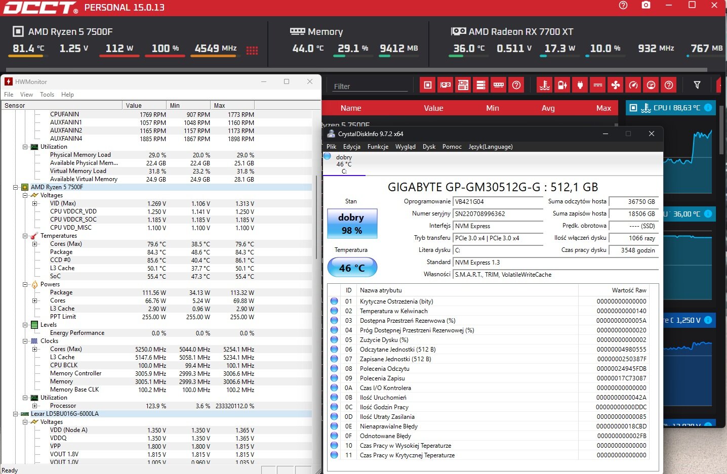 Hetmanv Opublikowano 27 Grudnia 2025 Zgłoś Opublikowano 27 Grudnia 2025 Witam. Mam problem ze swoim komputerem, tyle co uporałem się z jednym i pojawił się drugi. Mianowicie chodzi o to, że wykonałem format i pomimo 200 FPS w grze CS2 czułem ogromne ścinki. Wszystkie sterowniki są aktualne. Jedyną opcją było ustawienie limitu FPS na 143 w panelu AMD, wtedy gra chodziła płynnie, ale czasami też było czuć bardzo delikatną ścinę. Ten problem zażegnałem poprzez aktualizację BIOS'u do wersji 4.03 i ponownym zrobieniu OC przy pomocy filmiku (przed formatem też z tego korzystałem i wszystko było okej). Drugim problemem jaki teraz wyszedł jest nagły spadek wydajności w CS2, po odpaleniu gry przez +/- minutę jest idealnie (zero ścin, fps'y średnio 350-400), po minucie następuje gwałtowna zmiana i fps'y spadają do 250 i niżej oraz zaczynają się ściny. Wszystkie sterowniki są aktualne. Robiłem również test pamięci programem MemTest86 i nie wykazało nic niepokojącego. Użyłem również programu OCCT - też bez efektów. Co do dysku HDD, podpiąłem go niedawno po dość długiej przerwie, ma w jednej sekcji napisane "Zastrzeżone przez system (D:)" - czy możemieć to wpływ na system który jest zainstalowany na dysku SSD? Bardzo proszę o pomoc bo od 3dni bujam się z takimi problemami i powoli mi ręce opadają już do tego sprzętu. Temperatury w porządku. Mój sprzęt: Płyta główna: B650M-HDV/M.2 Procesor: AMD Ryzen 7500F Karta graficzna: AMD Radeon 7700 XT RAM: Lexar Ares CL30 DDR5 6000 MHz 2x16 GB Dysk SSD: Gigabyte GM30512G-G 500 GB Dysk HDD: wdc wd10ezrz 00htkb0 1TB Monitor: MSI G24C4 Curved 144 Hz Zasilacz: Corsair VS650W Znalazłem dość niepokojący objaw, wartość na zdjęciu GPU Clocks Grahpics, gdy wszystko jest idealnie pracuje w 2400-2500MHz, gdy fps'y spadają ipojawiają się ścinki spada do maksymalnie 1400MHz Cytuj Udostępnij tę odpowiedź Odnośnik do odpowiedzi Udostępnij na innych stronach Więcej opcji udostępniania...
